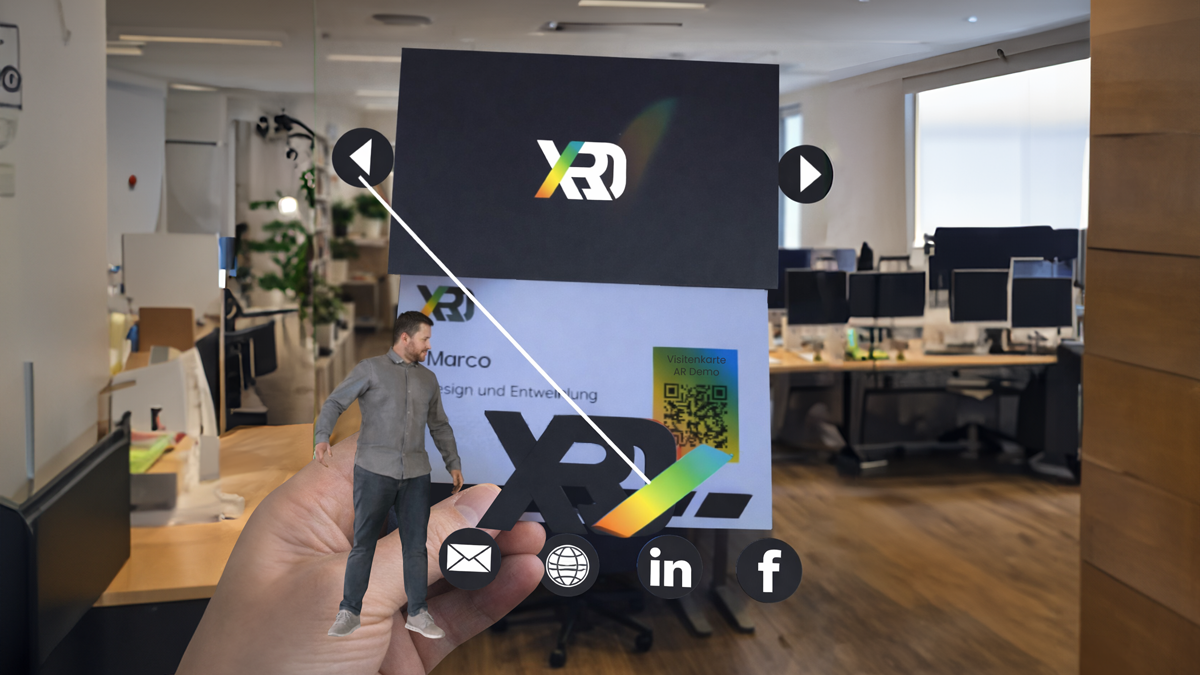 Beyond QR codes, we develop AR business card experiences including 3D business card integrations, interactive overlays, video introductions, product demos, 3D logo animations, and portfolio showcases. When someone scans your card, your brand appears in 3D, a video introduction can play, a virtual product demo can launch, or a contact-save and booking feature can open instantly.